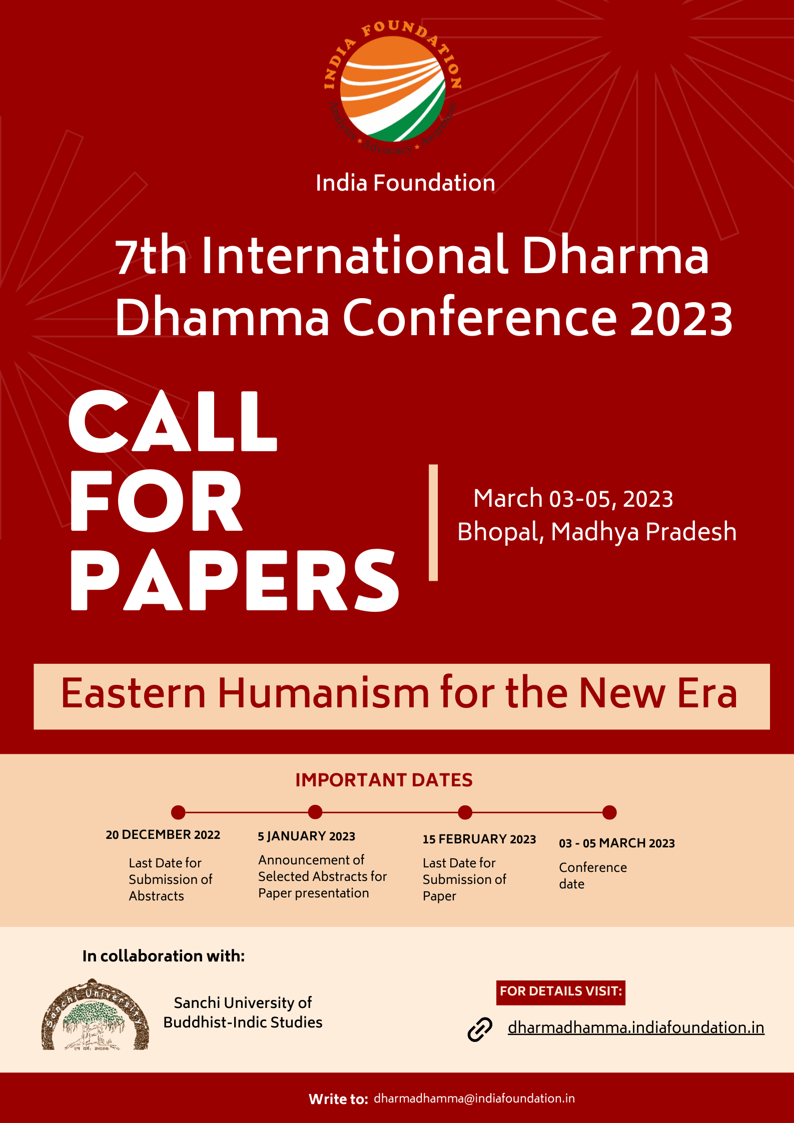 India Foundation, in collaboration with the Sanchi University of Buddhist-Indic Studies, is organising the 7th Dharma-Dhamma Conference (DDC) on 03-05 March 2023, in Bhopal, Madhya Pradesh, India. The theme of the DDC 2023 is “Eastern Humanism for the New Era”. The conference will seek to present and synthesize the dharmic perspective for a truly integral bio-humanism. The Conference aims to bring together religious, political and thought leaders from Dharma-Dhamma traditions to ponder over building a philosophical framework for the emerging new world order.